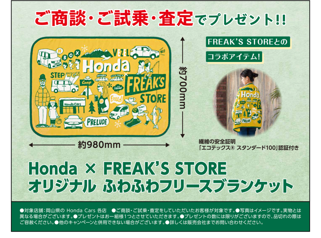 「Honda×FREAK‘S STORE オリジナルふわふわフリースブランケット」プレゼントしております☺