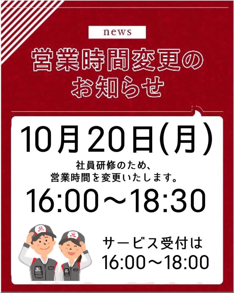 社員研修につき、営業時間を変更いたします。