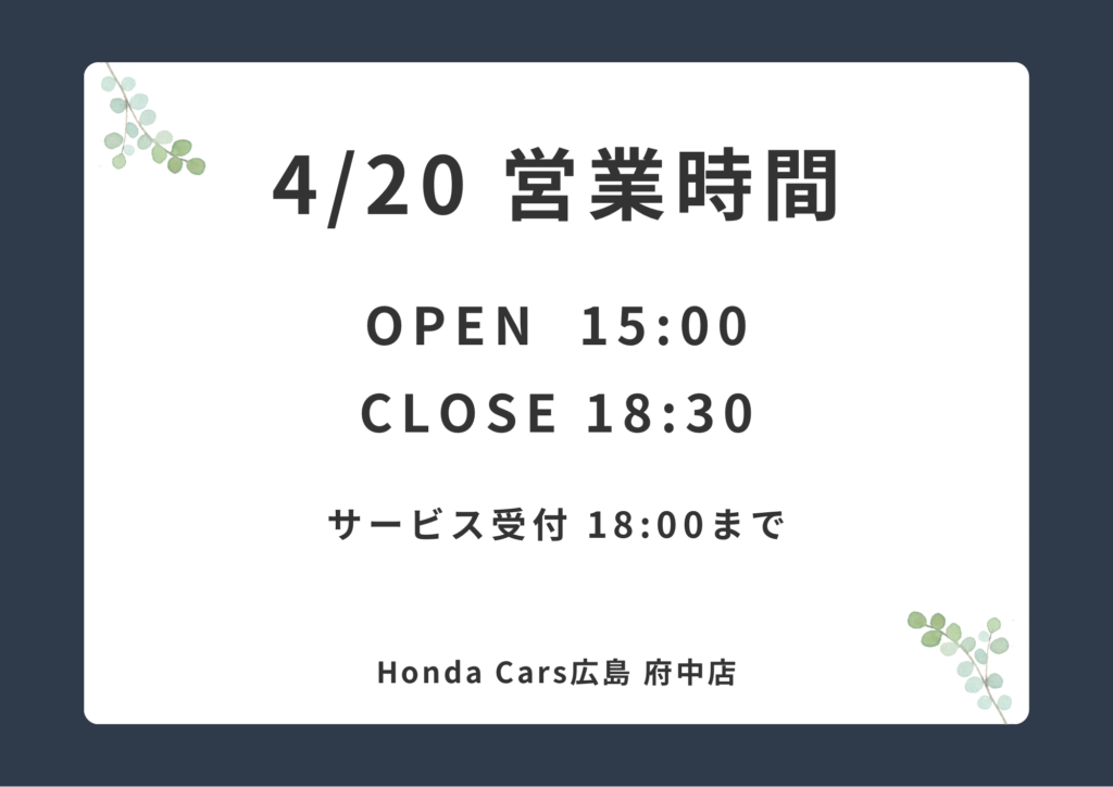 4月20日(月)は社内研修の為、営業時間15:00~18:30とさせていただきます。