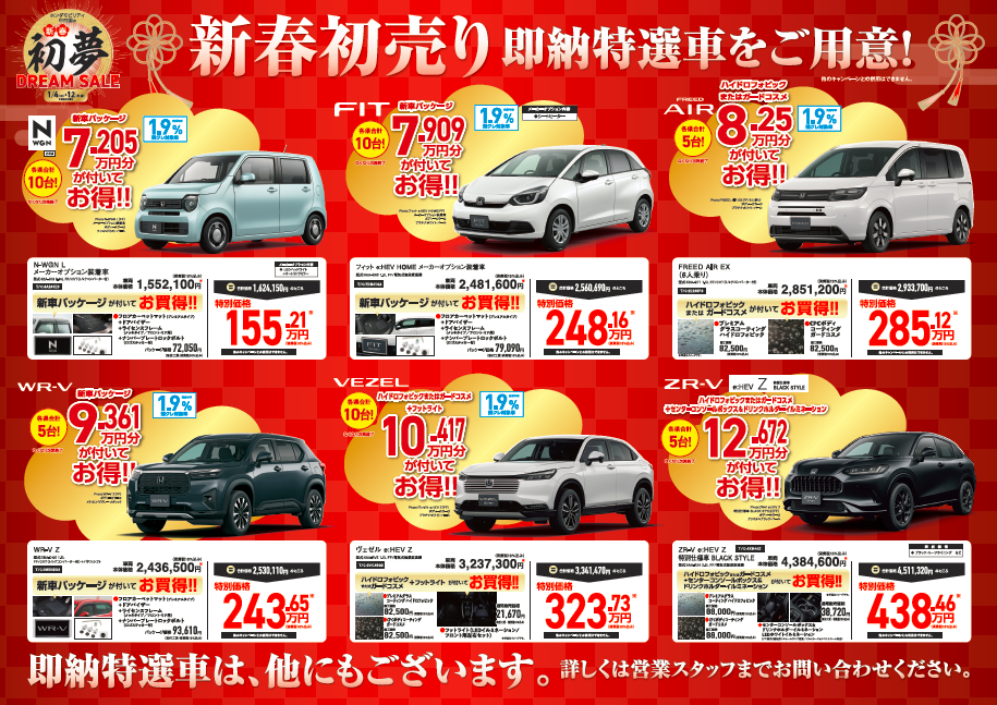 ※即納車は台数限定、タイプ・カラーなど詳しくはスタッフまでお尋ねください。