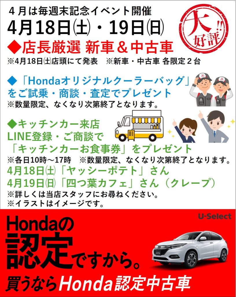 4月18日㈯・19日㈰は、Honda Cars 高知 一宮店へぜひご来店ください。