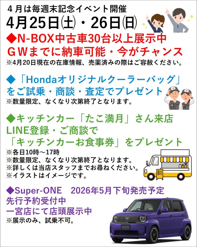 4月25日㈯・26日㈰は、Honda Cars 高知 一宮店へぜひご来店ください。
