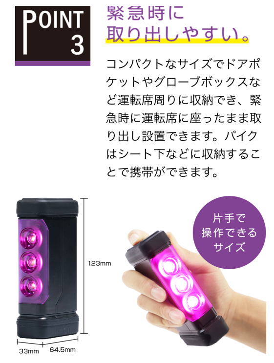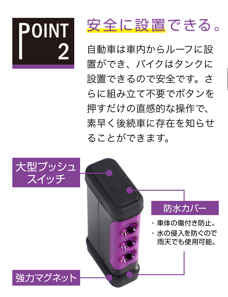 組み立て不要で素早く後続車に存在を知らせることができる。