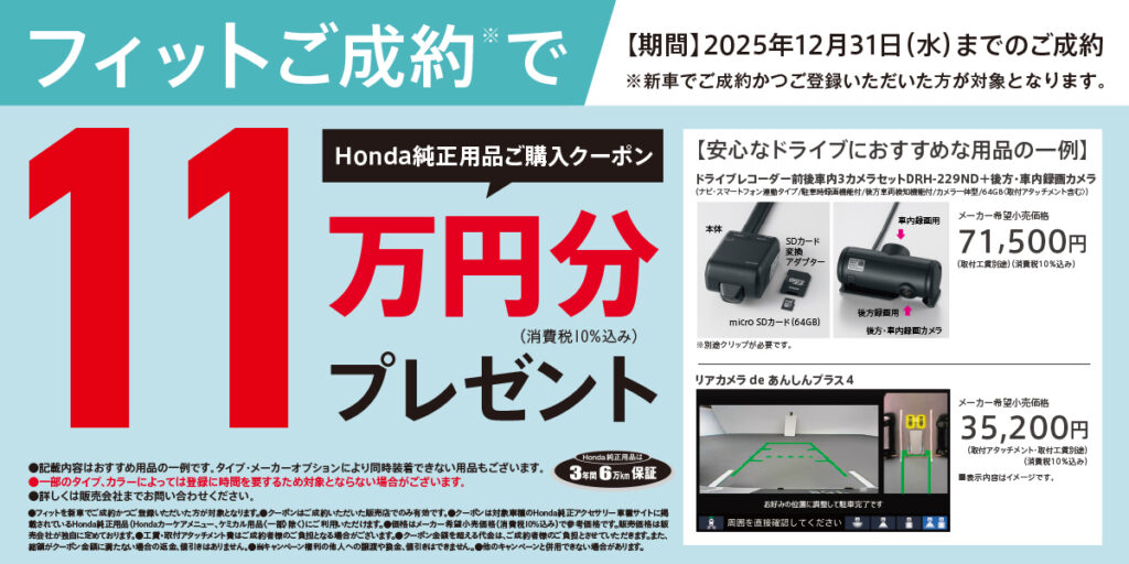 フィットご成約でHonda純正用品ご購入クーポン11万円分プレゼント