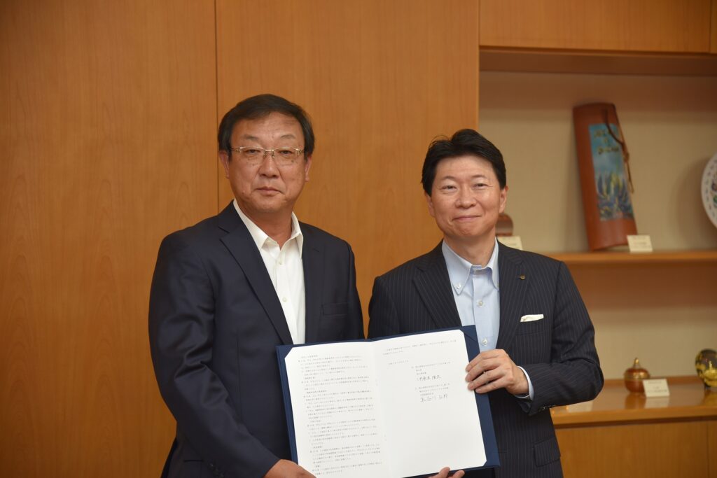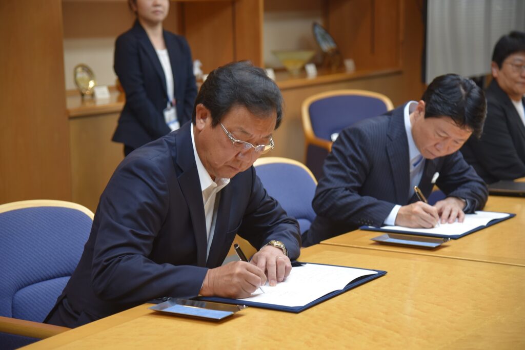 photo:調印式のようす (右)岡山県知事 伊原木隆太 様 (左)弊社 代表取締役社長 長谷川弘邦