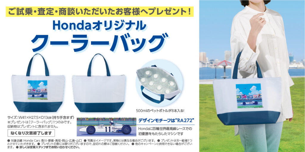 2026-04-01 ご試乗・査定・商談いただいたお客様へHondaオリジナルクーラーバッグプレゼント! ●対象店舗:Honda Cars 香川・愛媛・高知・岡山・広島・山口●写真はイメージです。実物とは異なる場合がございます。●プレゼントはお一組様1つとさせていただきます。●プレゼントの数には限りがございますので、品切れの際はご容赦ください。●他のキャンペーンと併用できない場合がございます。●詳しくは営業スタッフまでお問い合わせください。