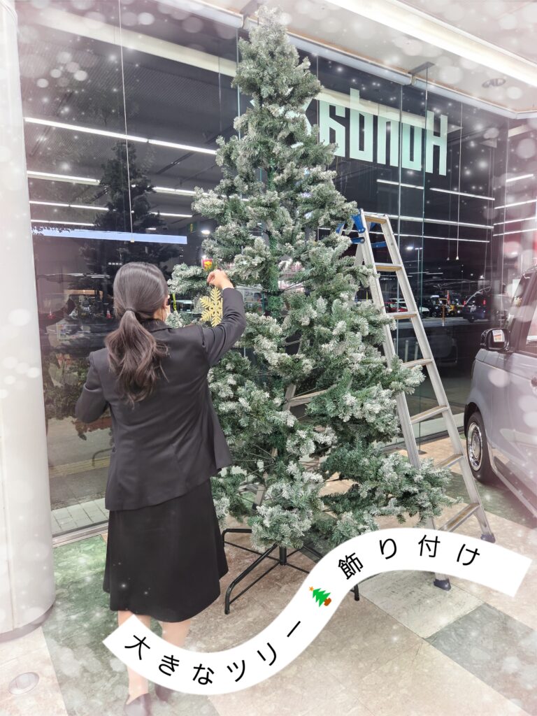 当店のツリー大きいんですよ。脚立がないと上の方は届きません。